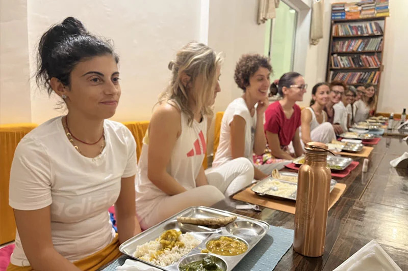You can choose a private or shared room with an attached bathroom and hot water. You will eat fresh, seasonal vegetarian meals prepared with local ingredients. We include spices like ginger and cumin to help your digestion stay balanced during your training. Avoid heavy or processed foods to keep your energy high for practice.